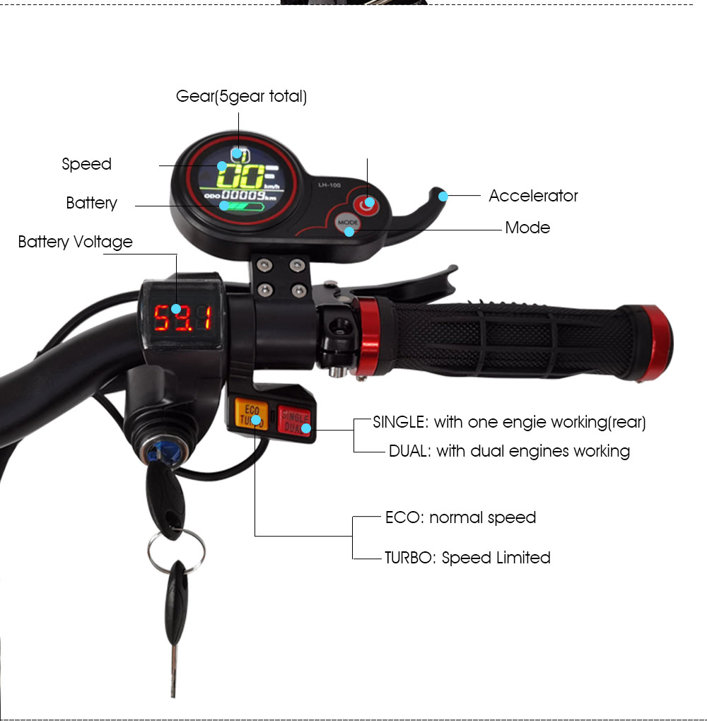 | | Autonomia/Distância: Bateria de 40Ah: 80-120 km Bateria de 50 Ah: 100-150 km Bateria de 80 Ah: 150-250 km (Testado com base no peso do ciclista (60 kg), terreno plano, temperatura de 30 graus e velocidade constante...) |